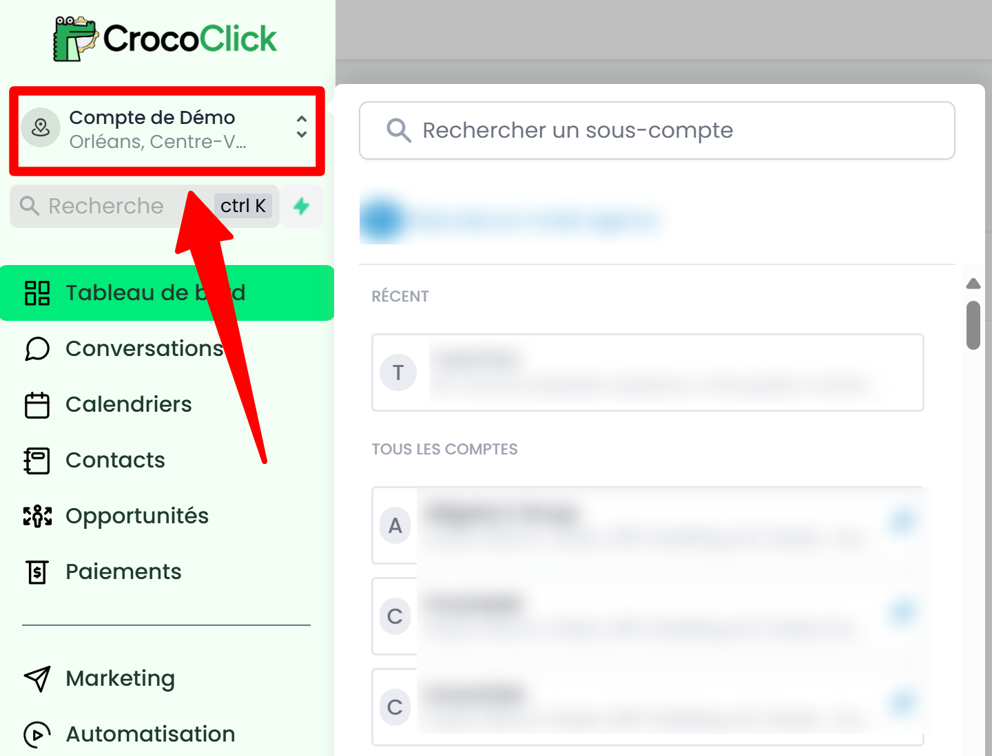 Une fois que vous avez accès à plusieurs comptes CrocoClick, il est très simple de basculer entre eux :