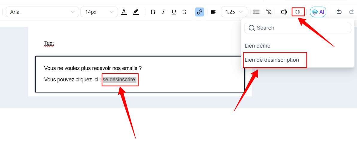• Sélectionnez le texte, insérez le lien déclencheur en cliquant sur l'icône d'ajout de lien, et choisissez votre lien de désinscription dans la liste.