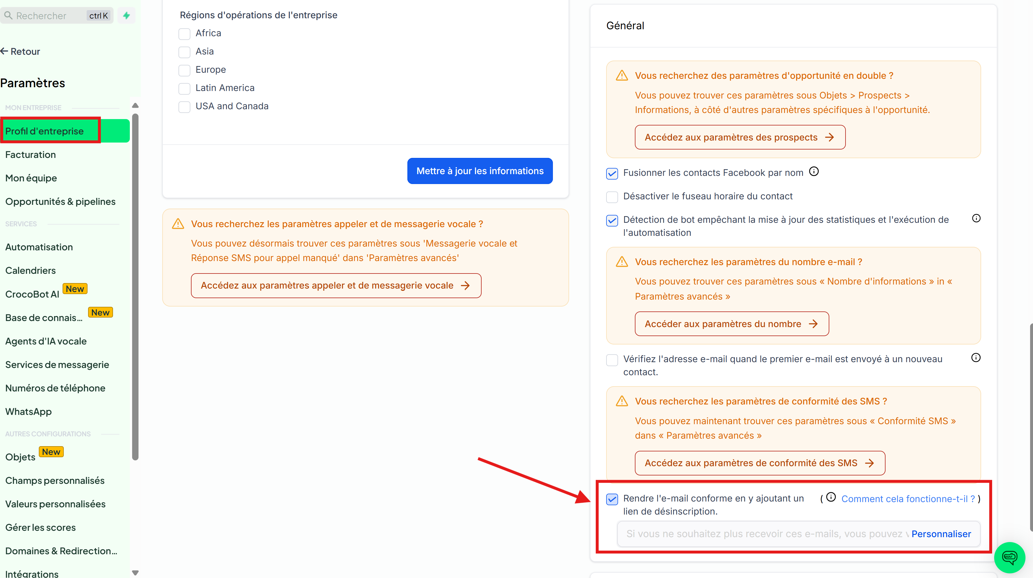 3. Activez/désactivez l’option Inclure le lien de désinscription