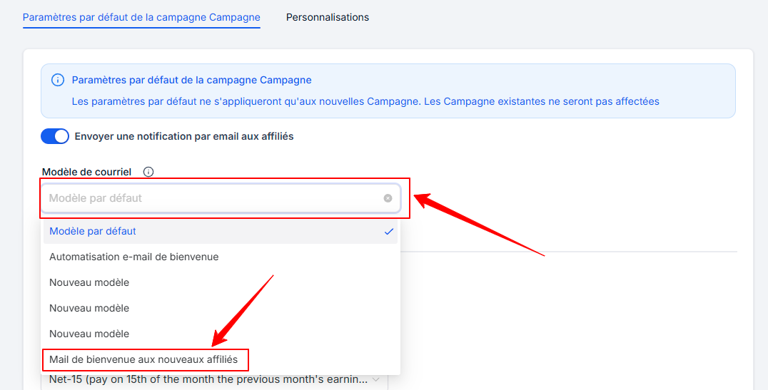 💡ASTUCE : La modification du modèle de mail par défaut n'affecte pas les campagnes d'affiliation déjà existantes. Pour que les nouveaux affiliés reçoivent le mail personnalisé, pensez à mettre à jour manuellement les paramètres dans chaque campagne existante.