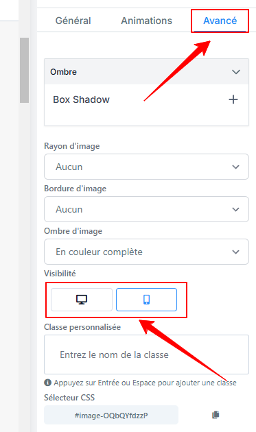 Dans la section Visibilité, décochez l’icône "Mobile". Cela garantit que cette image ne sera visible que sur les appareils desktop.