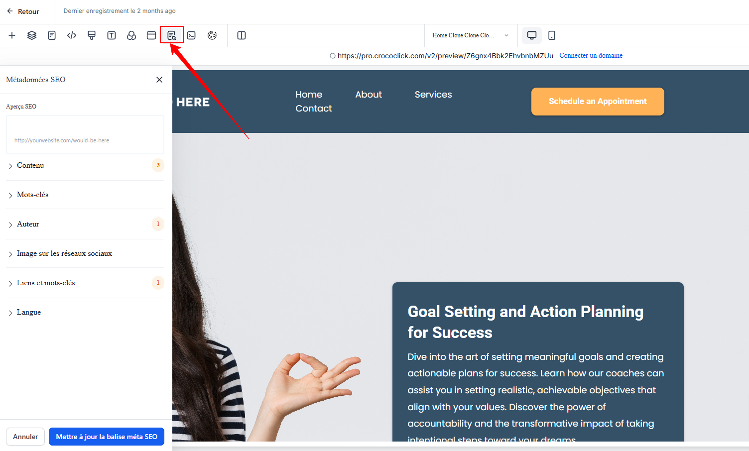 Rendez-vous sur votre page et allez dans la section dédiée aux métadonnées SEO de votre page.