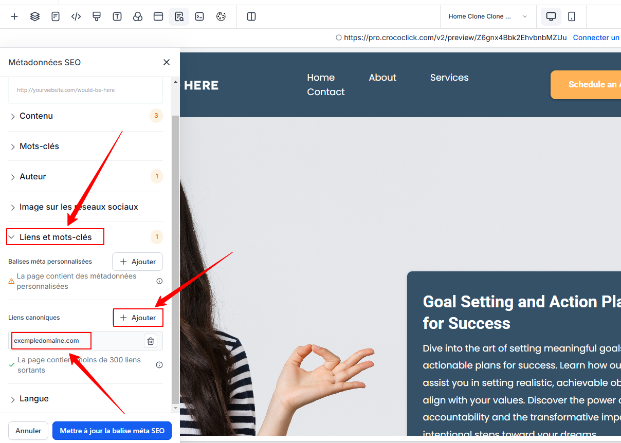 Dans le champ Liens et mots clés, cliquez sur Lien canonique, renseignez l’URL de la page principale que vous souhaitez indexer (par exemple, exempledomaine.com).