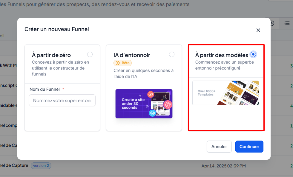 Cliquez sur + Nouveau funnel > À partir d’un modèle > Continuer