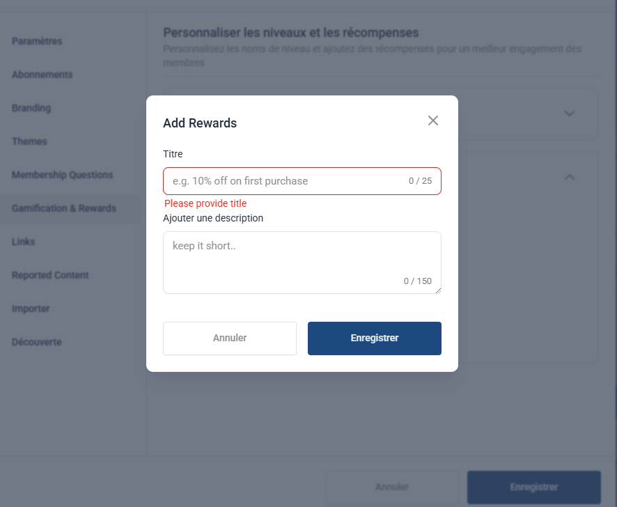 💡 ASTUCE : pour le moment, les récompenses ne sont pas automatiquement liées à un niveau. Elles doivent être gérées manuellement par l’administrateur.
