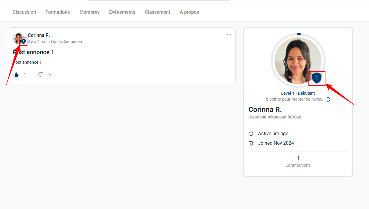 Le badge du profil du membre affiche son niveau actuel