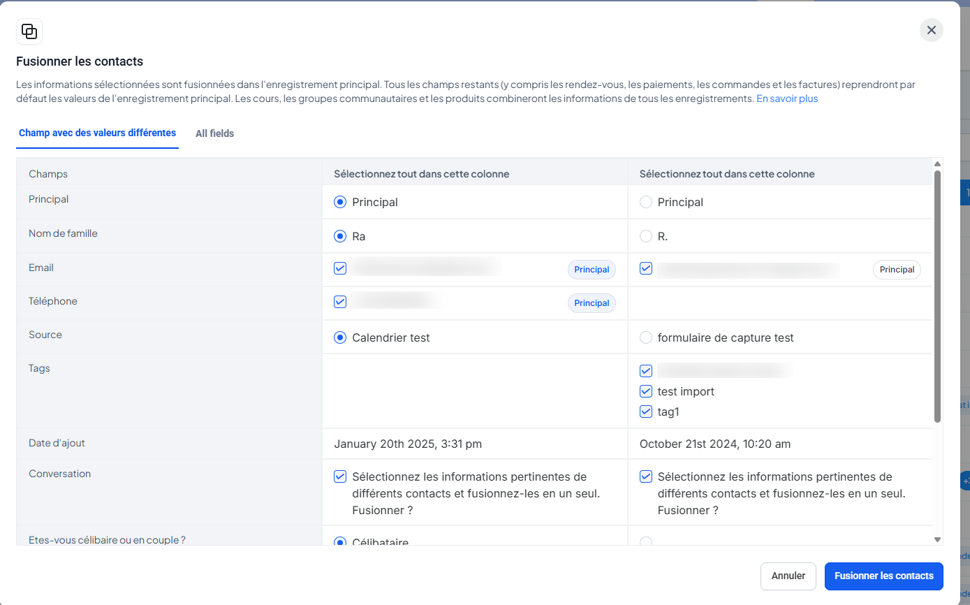 Le contact principal est celui dont les données principales seront conservées. Les autres données seront ajoutées si le champ est vide.