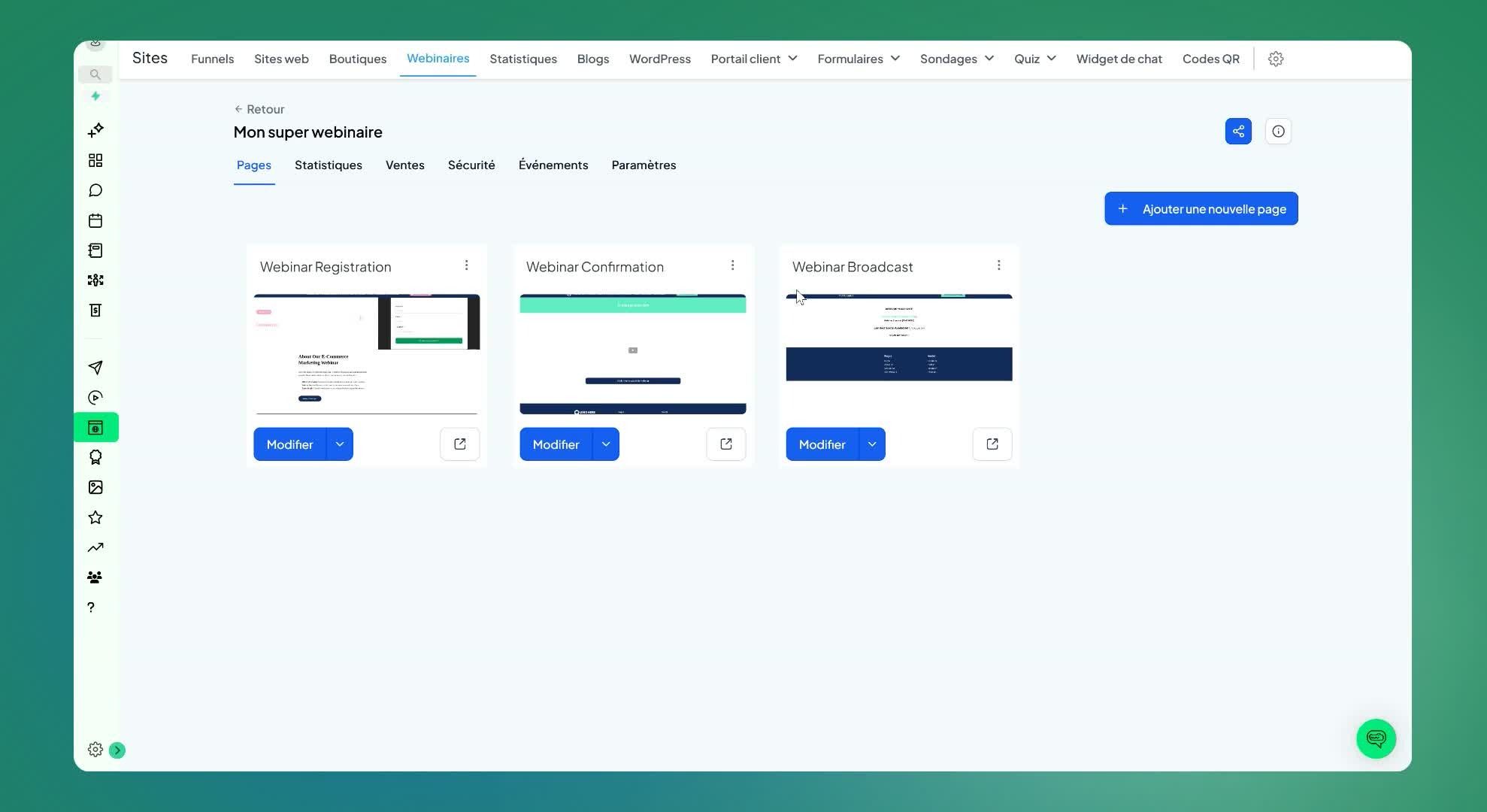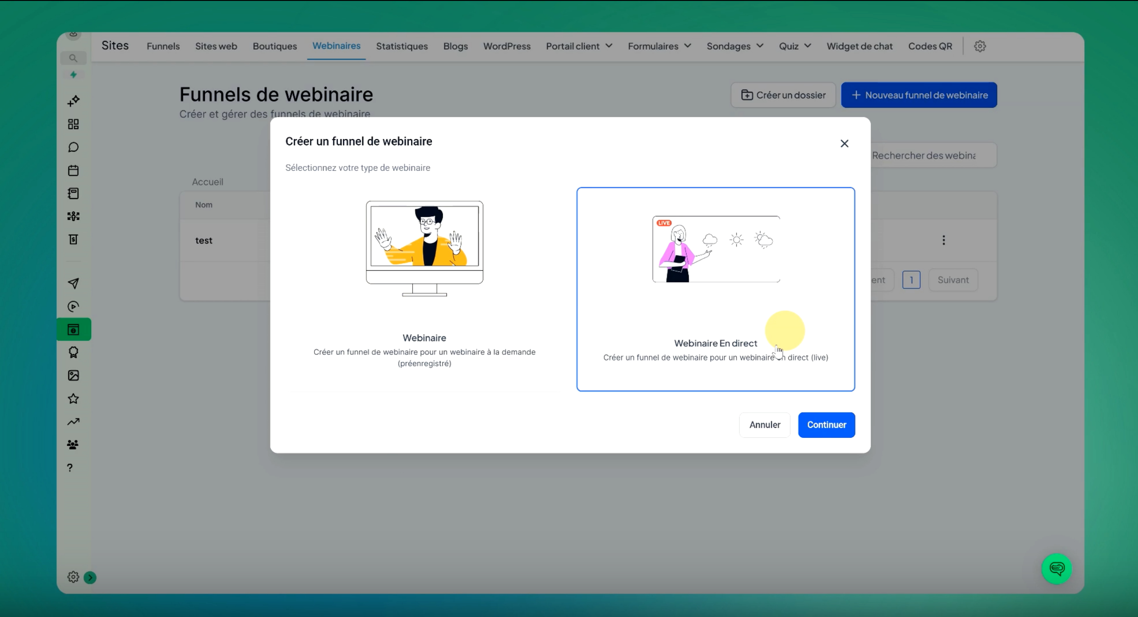 Cliquer sur 'webinaire' pour accéder à la page des funnels de webinaire.