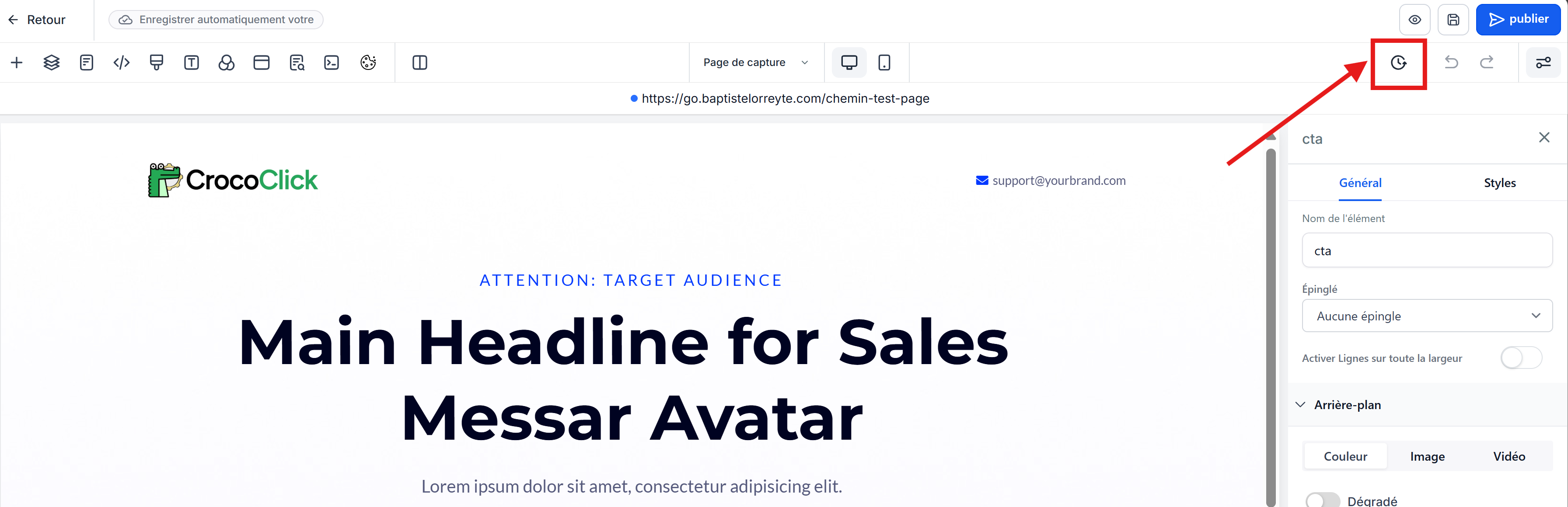 Ne perdez plus vos progrès dans le constructeur de page CrocoClick : Auto-Save (enregistrement automatique) enregistre vos modifications en temps réel et l’Historique des versions vous permet de restaurer vos anciennes pages en un clic