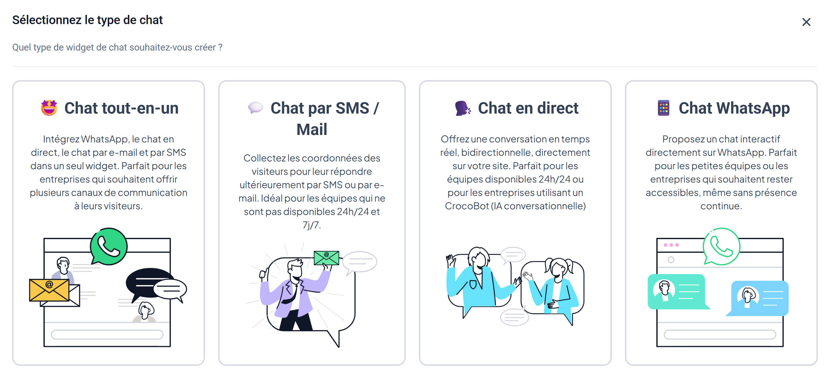 Tu peux coupler le Widget de Chat avec CrocoBot AI, pour laisser ton chatbot gérer les questions récurrentes (tarifs, horaires, process).
