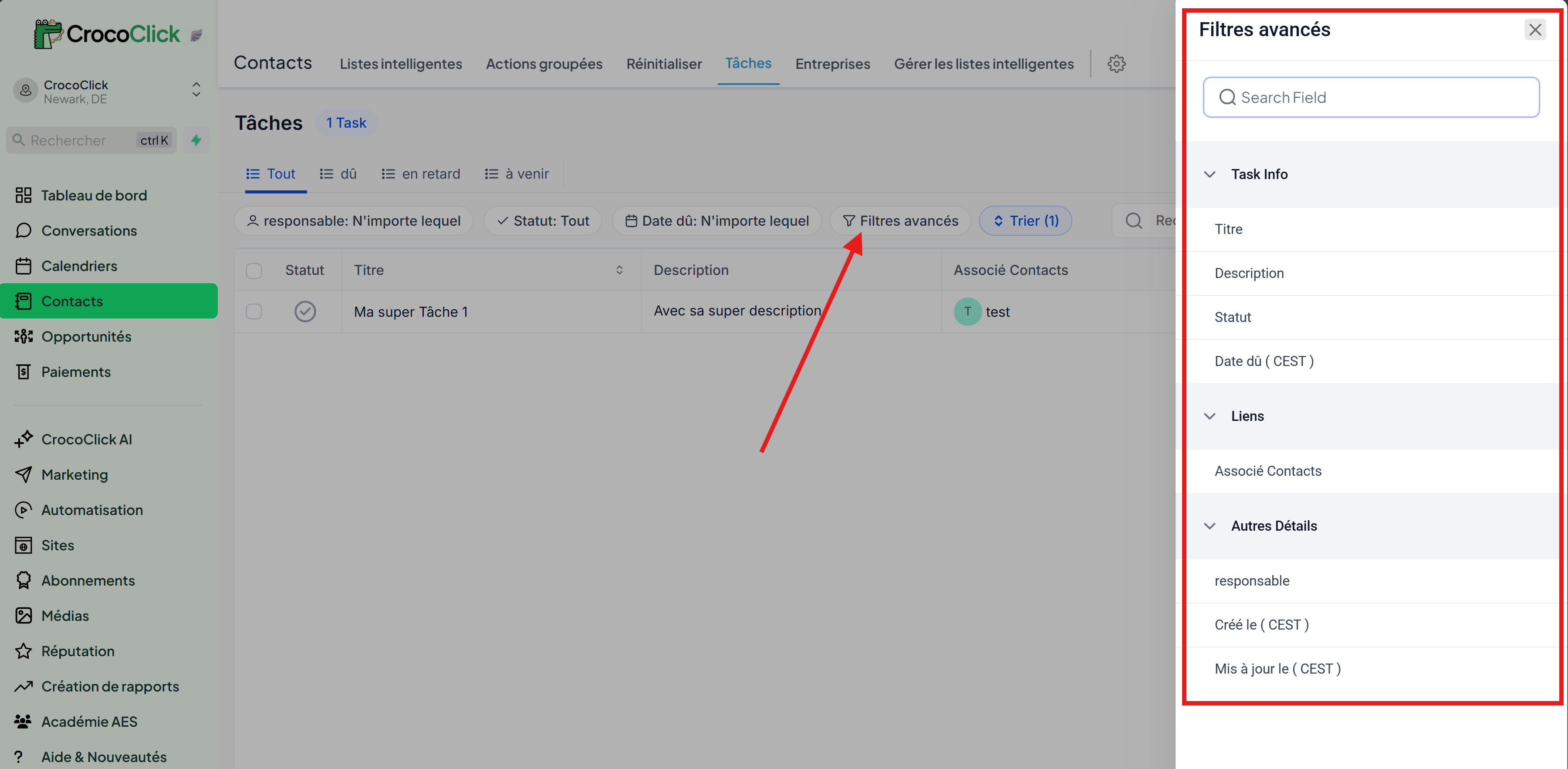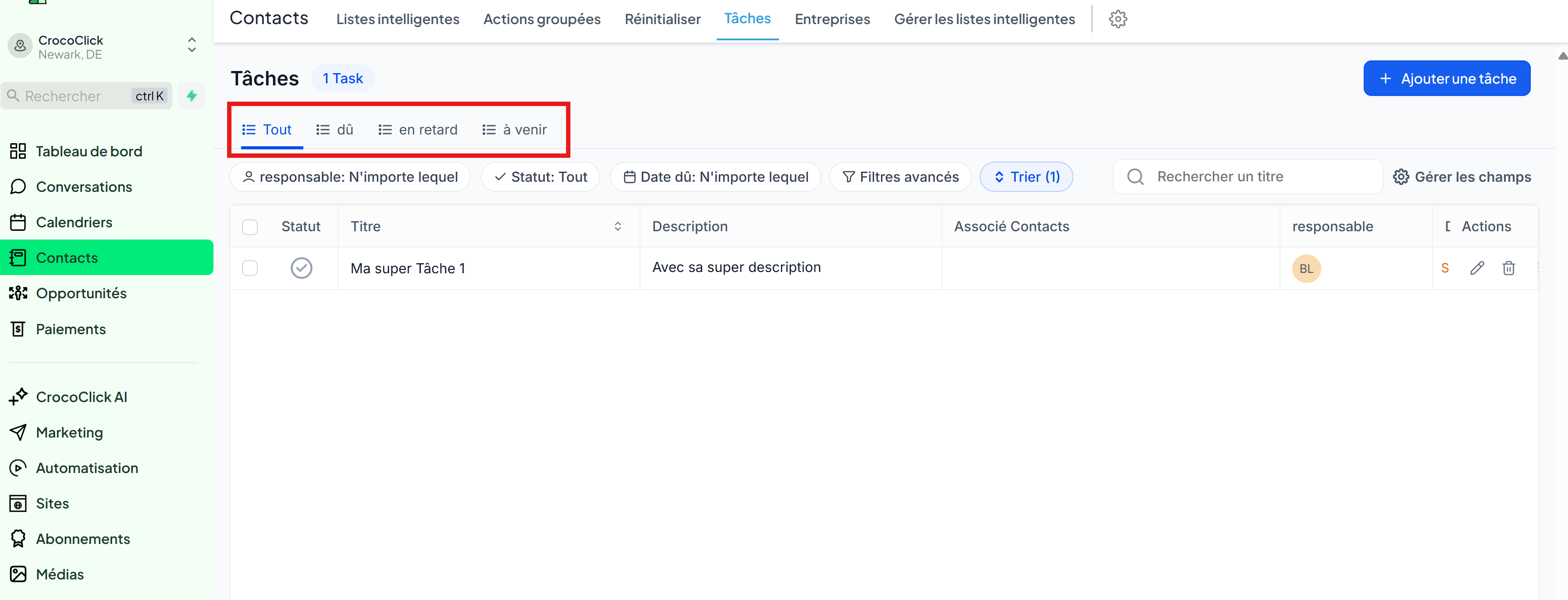La gestion des tâches dans CrocoClick vous permet d’organiser vos actions, de suivre vos deadlines et de collaborer efficacement avec votre équipe. Voici un guide complet pour tirer parti de toutes les fonctionnalités.