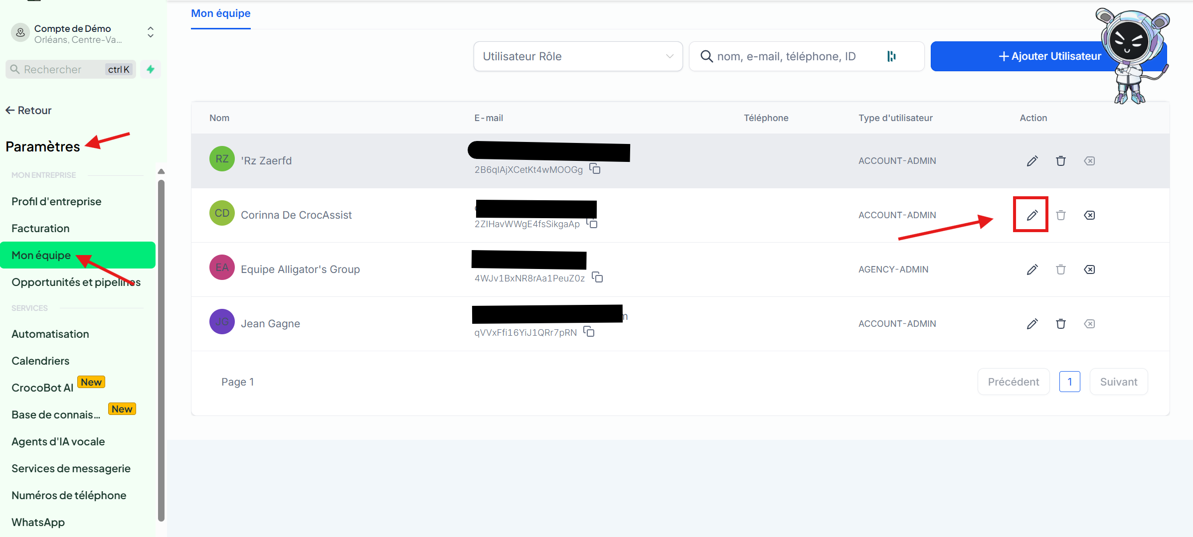 4. Trouve ton profil dans la liste et clique sur l’icône de crayon ✏️ à droite pour modifier ton compte.