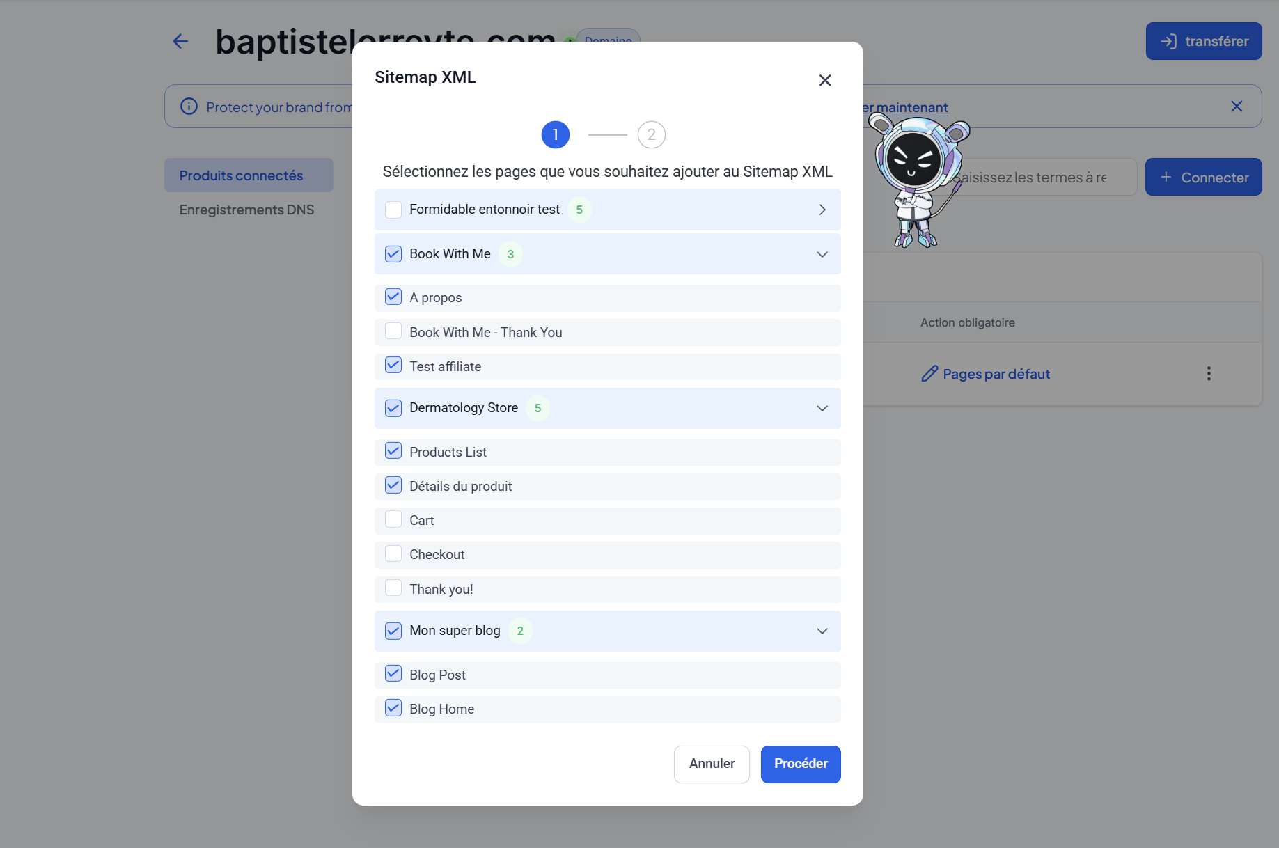 Dans la page des produits connectés, cliquez sur les 3 points du domaine ou sous-domaine pour lequel vous voulez créer un sitemap xml.