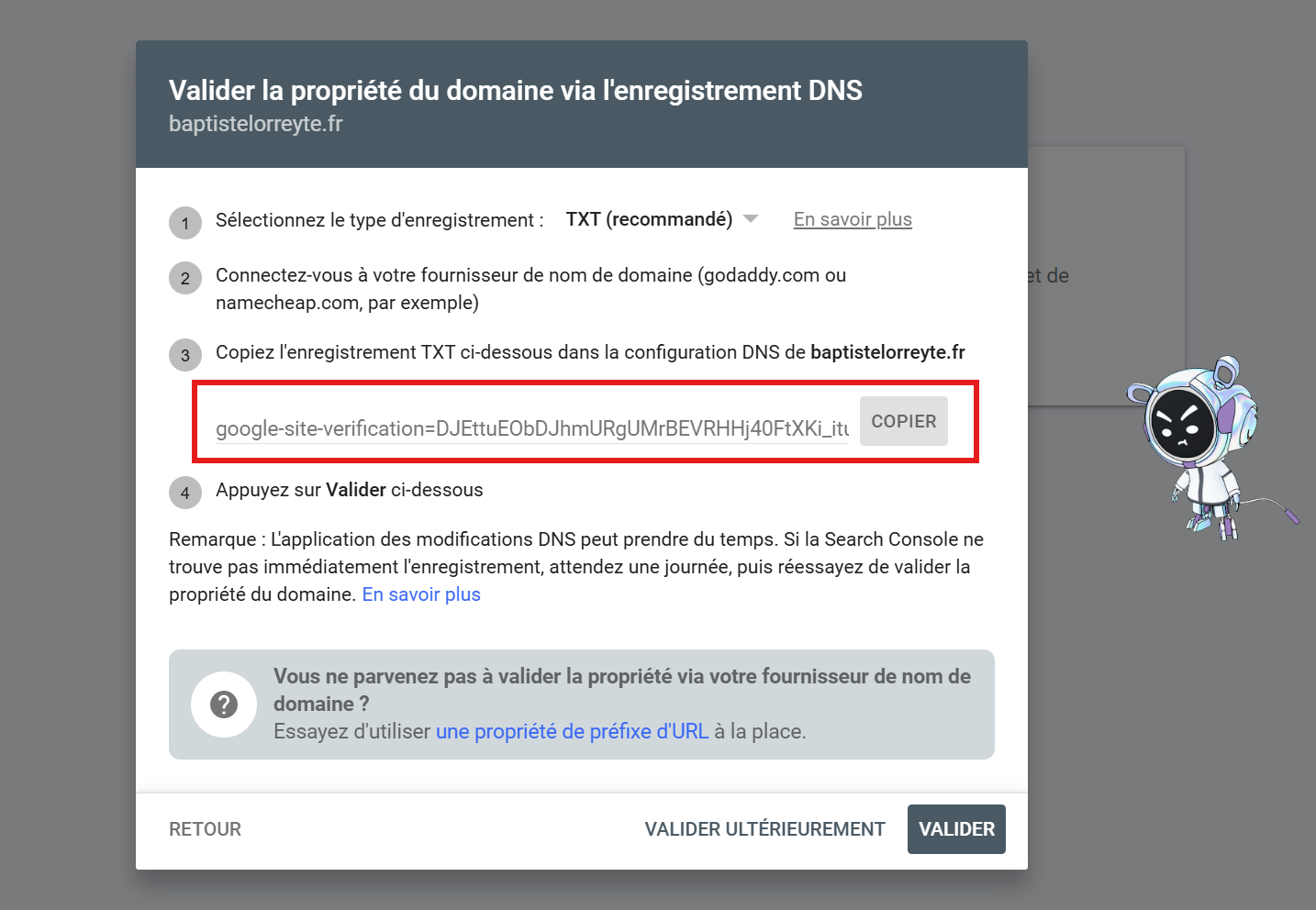 Google doit s’assurer que vous êtes bien propriétaire du domaine. Vous pourrez valider cette propriété :
