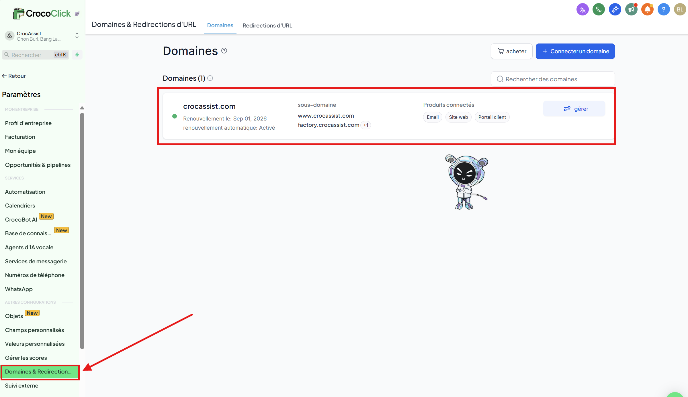 Pour relier votre domaine à un élément créé dans CrocoClick (site, tunnel, boutique, blog, etc.) :