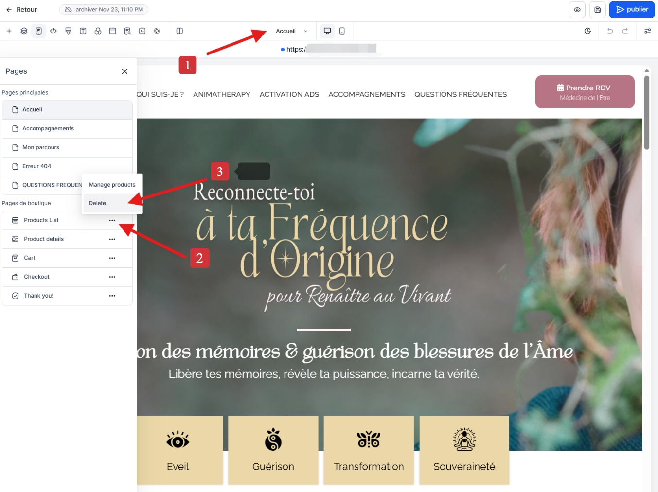 Si vous avez créé une boutique pour un test ou que vous n’en avez plus besoin, vous pouvez la supprimer très facilement en supprimant depuis le constructeur de page n’importe quelle page créée automatiquement lors de l’activation du mode “e-shop”.