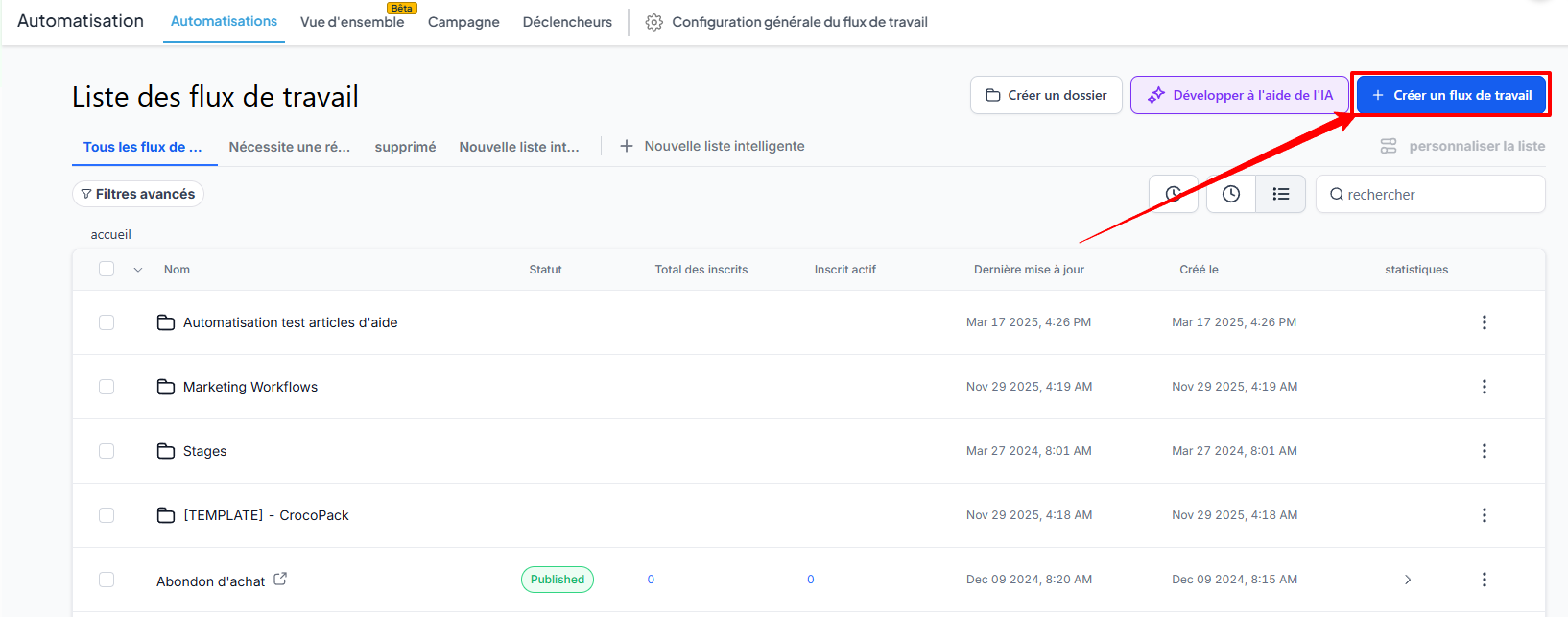 Rendez-vous dans Automatisation et cliquez sur + Créer un flux de travail ou modifiez une automatisation existante selon vos besoins.