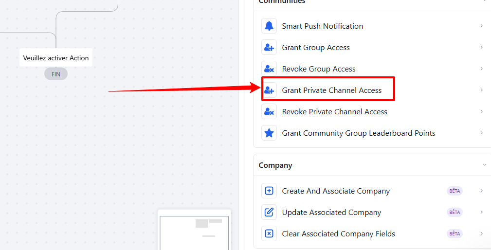 Cliquez sur + Ajouter une action, puis dans la liste, sélectionnez : Grant Private Channel Access