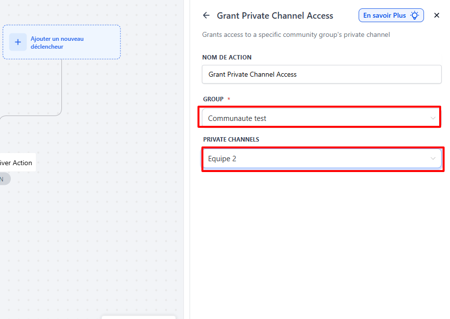 Cette action permet d’ajouter automatiquement un membre à un canal privé spécifique.